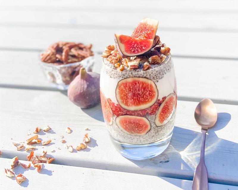 BREAKFAST: Today’s breakfast is a fig, pecan and honey chia pudding. Chia seeds are an ancient superfood – they were a mainstay of Aztec and Mayan diets thanks to their nutritional value. They are great for gut health and an excellent way of increasing your fibre intake. I mix half a cup of chia seeds with one cup of non-dairy milk – mix them together with an optional sweetener (I use honey or maple syrup) in a mason jar and sit in the fridge for an hour or until set. Then add in your fresh fruit, nuts and yoghurt. I also have a matcha latte mid-morning.