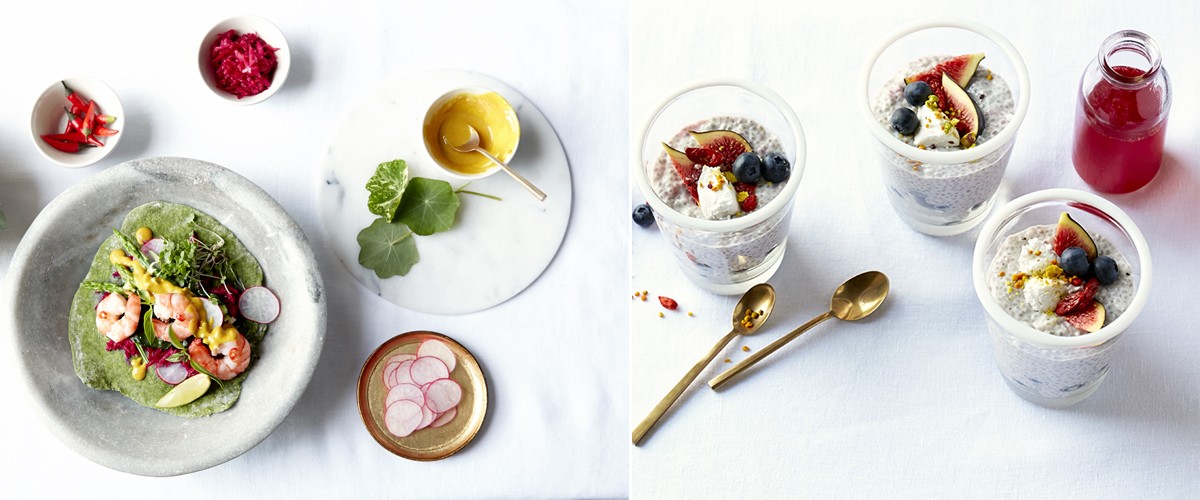 Highlights? Banana protein waffle with coconut yoghurt; egg wrap with spinach and pesto; prawn poke bowl; and lemon chicken with cauliflower puree and black rice.