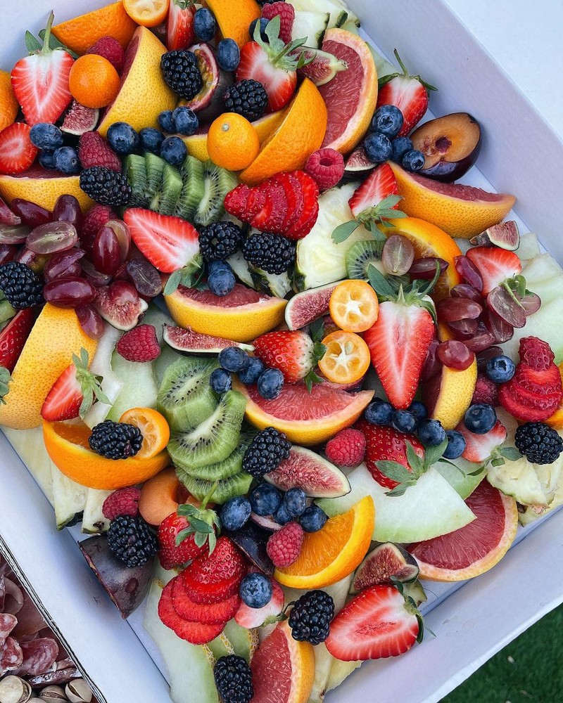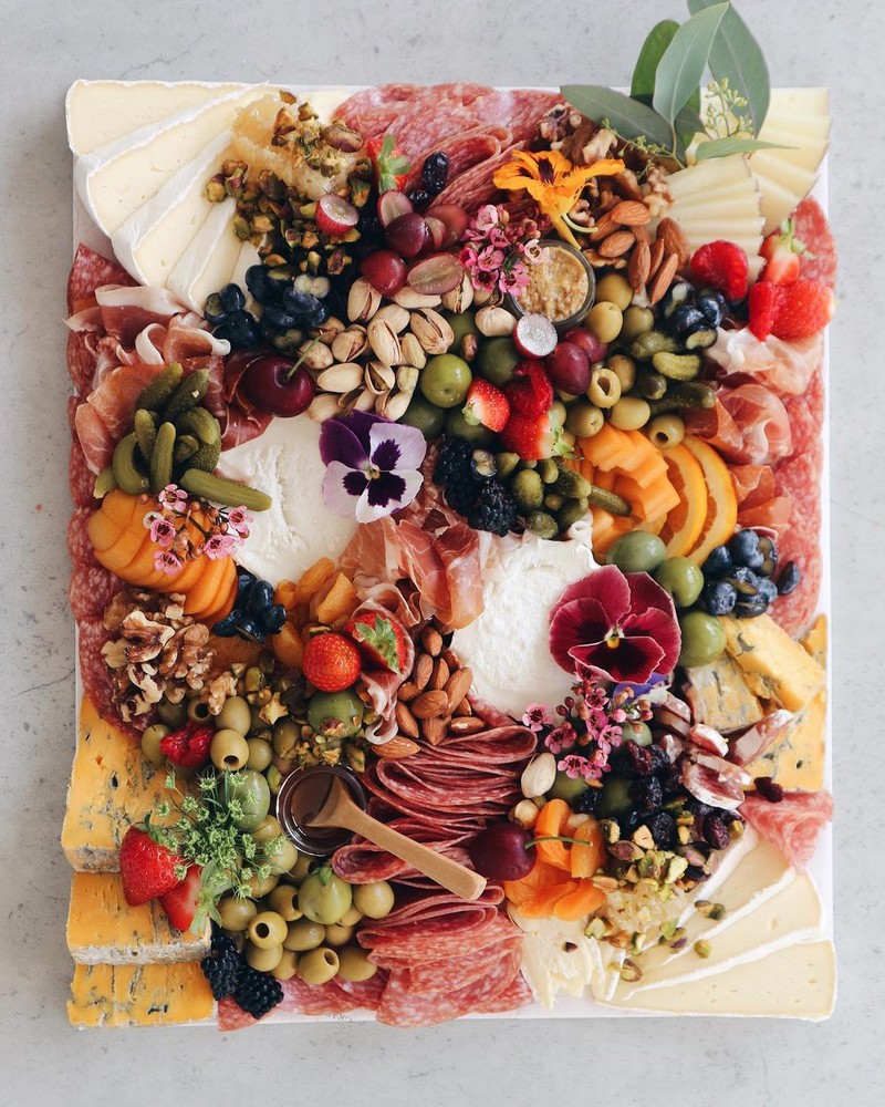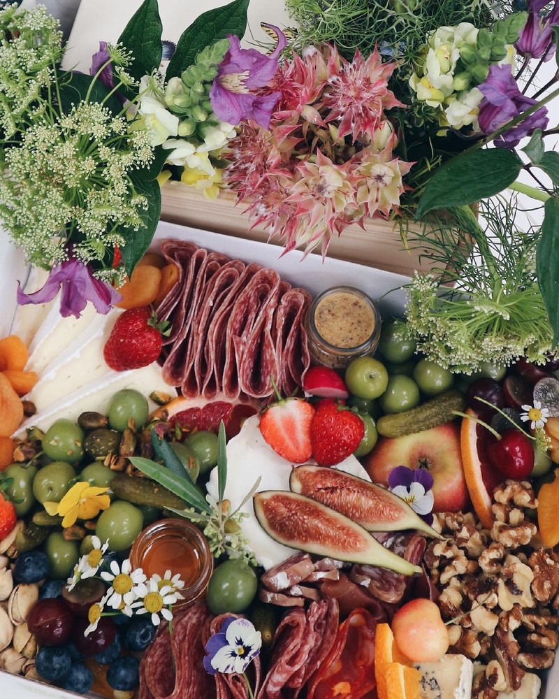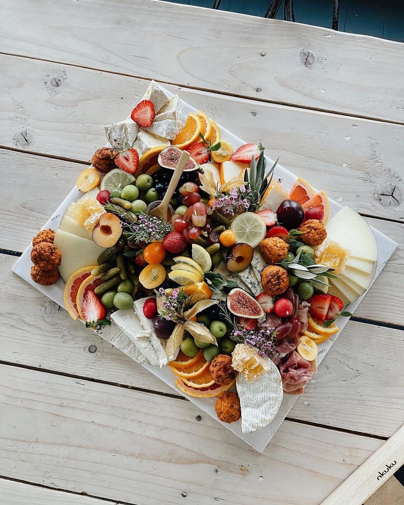 Without doubt, a good grazing platter comes down to the quality of the cheese. We love using a Shepherds Purse blue, Baron Bigot brie-style cheese and a Snowdonia truffle cheddar. Fresh honeycomb (we use London Honey Company) tastes incredible and the power of a good quality, artisan cracker shouldn’t be underestimated – we use Peter’s Yard 16-hour baked sourdough crackers. Remember, we eat with our eyes, so an array of delicious fresh and dried fruit, jewel-coloured antipasti and edible flowers like violas are a must.