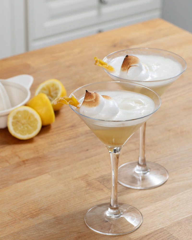 Pipe the Italian meringue over the sorbet and brown with a blow torch. Finally, top the meringue with a piece of the candied lemon peel.