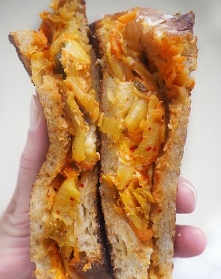 BREAKFAST: After quite a bit of cooking last night I want something quick and cheesy. I’m a huge fan of kimchi and love adding it to a grilled cheese sandwich – just be sure to butter both sides of the bread when you fry it. There are lots of good kimchi brands, but my favourite is The Cultured Collective.