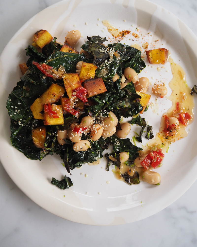 SUPPER: This is a very quick supper of butterbeans, roasted squash and cavolo nero with chilli oil. Sometimes just three ingredients and a good sauce is all you need. For a speedier dish, be sure to cut the squash into small cubes so it cooks more quickly. You can also do this with kale, and then squeeze over citrus juice and zest as it comes out of the oven.