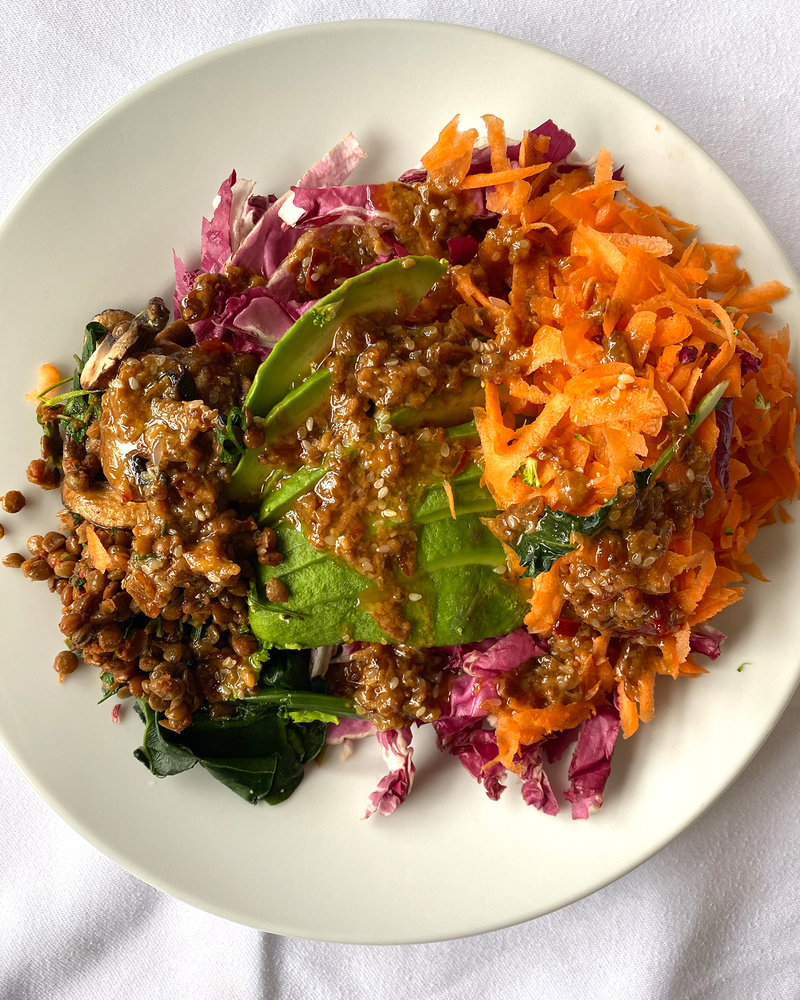 LUNCH: Today’s lunch is a fridge forage of blanched cima di rapa (from the broccoli family), walnuts, radish, lentils, spinach, avocado, pumpkin seeds and coriander. I try to eat a good bowl of veggies like this for lunch a few times a week and always pair it with a punchy dressing to bring everything to life – today’s is my go-to tahini dressing with soy sauce, apple cider vinegar, maple syrup and lime juice and zest. I indulge a lot at the weekend, so this type of lunch really balances things out – plus, it’s delicious.