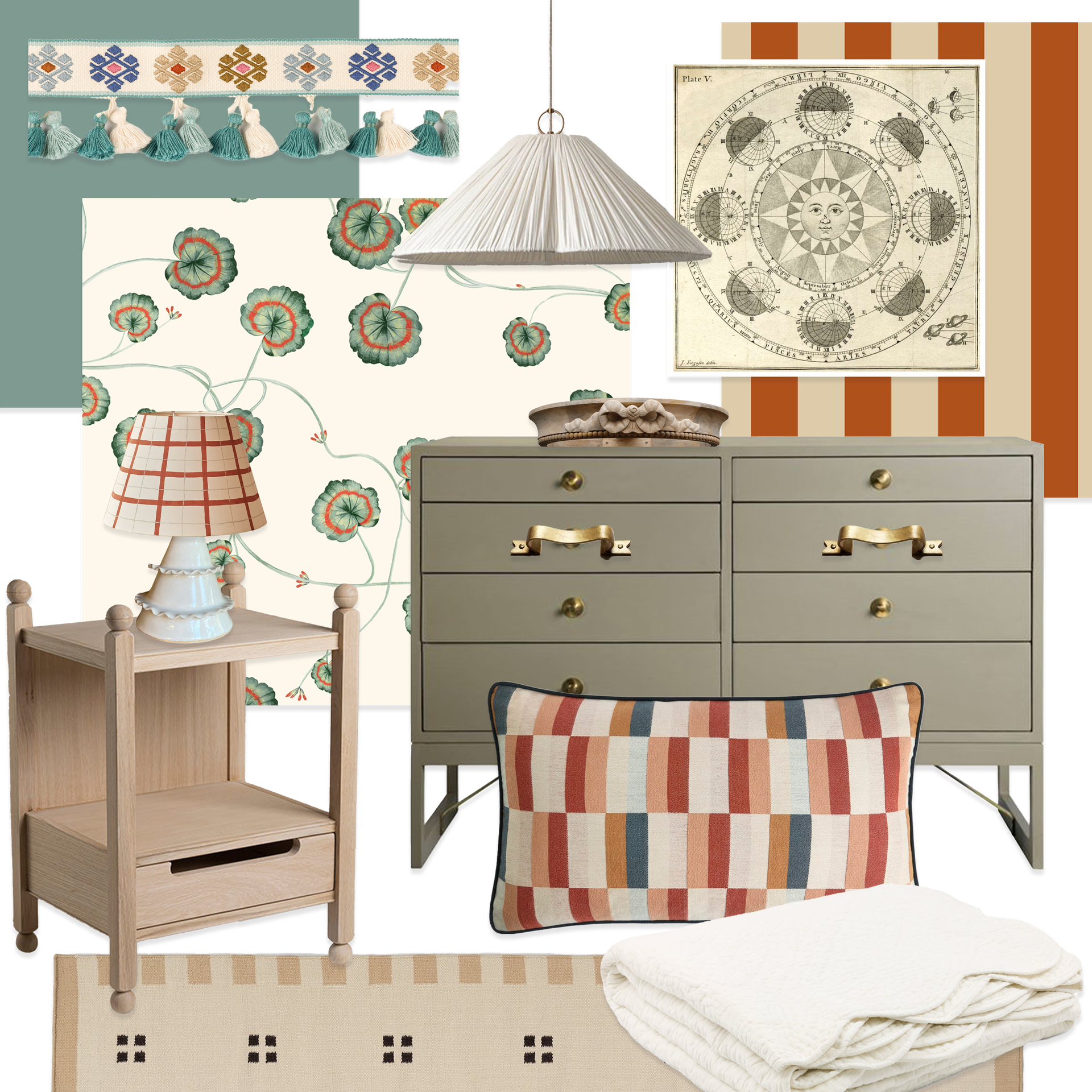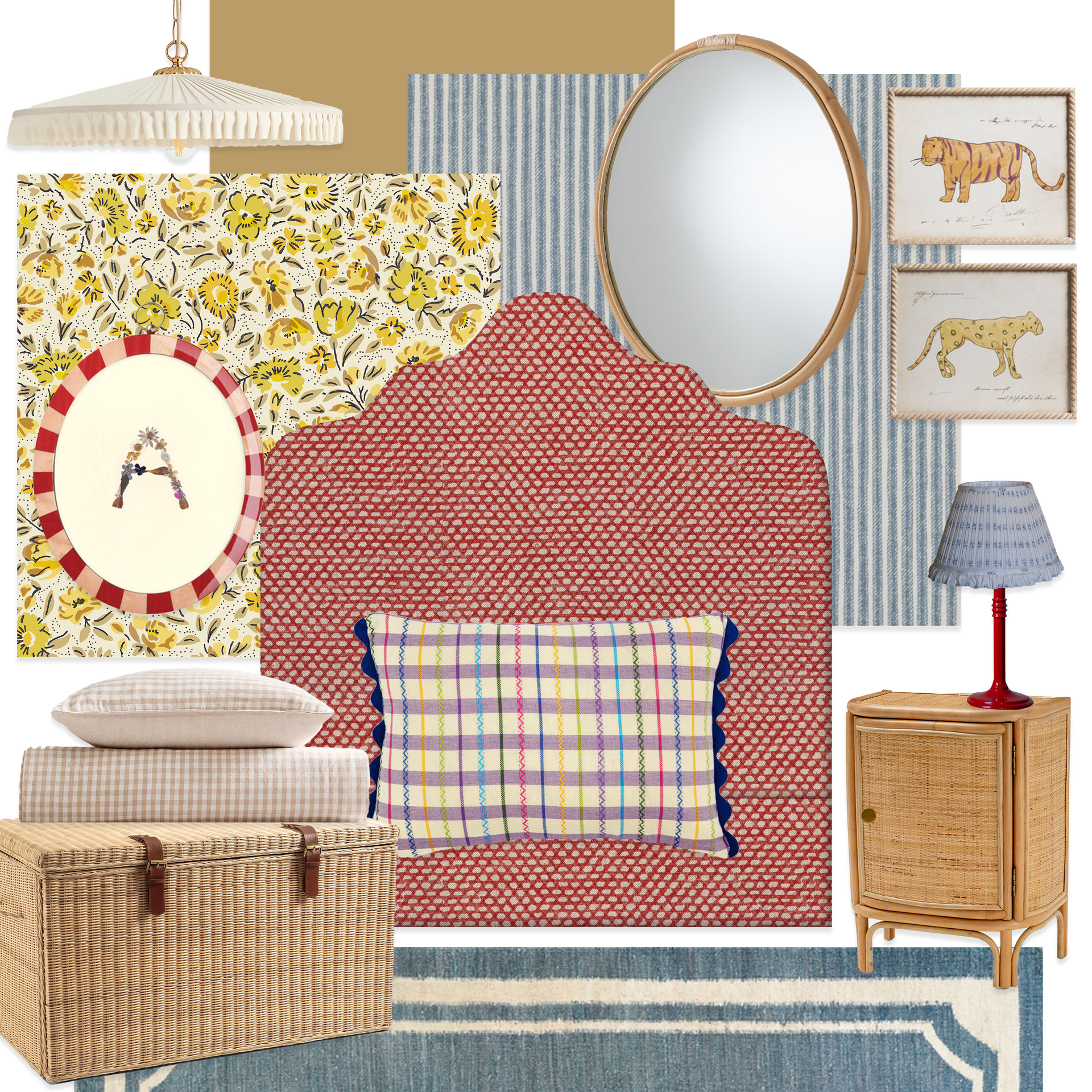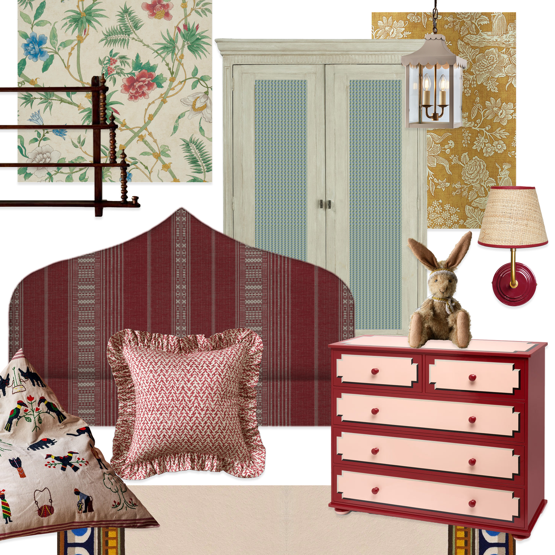 I love mixing in fun, unexpected pieces like this glossy red chest by The Lacquer Company. I’d pair it with vintage treasures that might one day become family heirlooms. I have a soft spot for a fret mirror, and I think this one from Custodian Antiques would look so special above the chest of drawers. It’s all about creating a space that feels magical now but will gently grow with them over time.