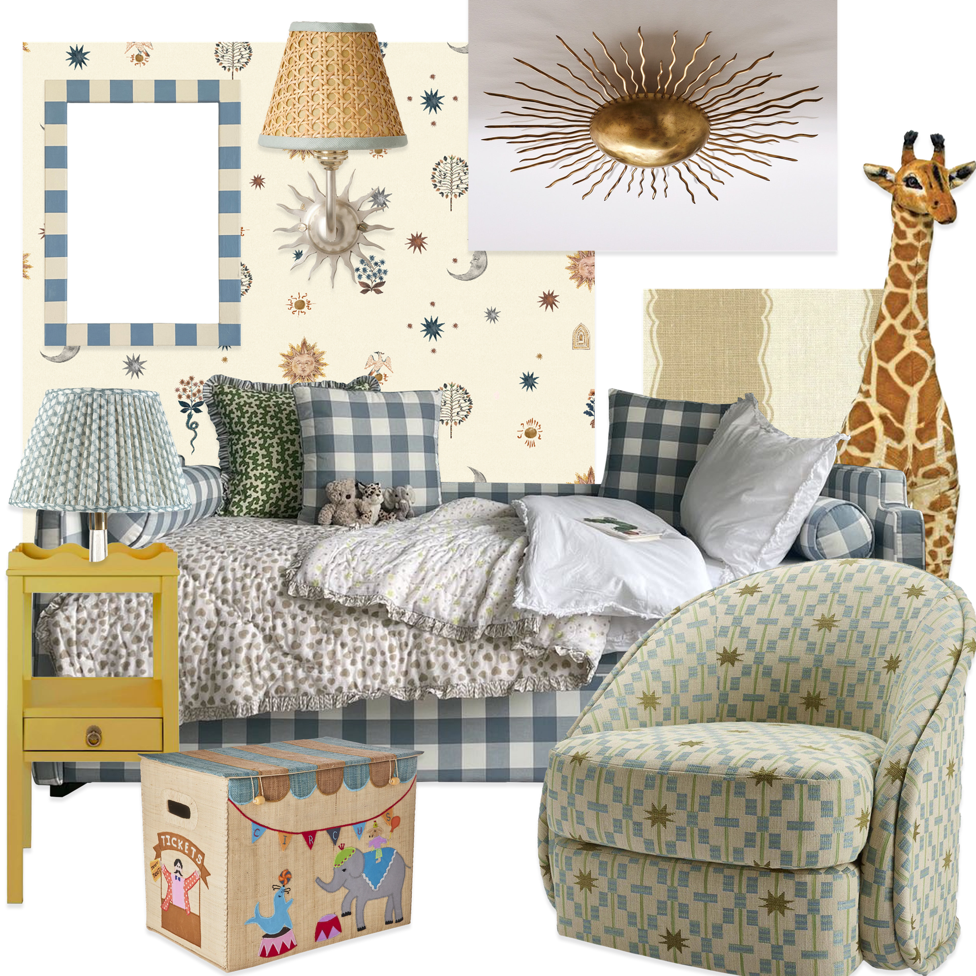 When it comes to children’s bedrooms, I always try to find the right balance between magical and stylish, timeless and fun, and reflect the imaginative, playful nature of the child’s age without restricting them as they grow. This yellow and blue, sun-and-moon-inspired scheme is fairly gender neutral, and leans into the magic of the sky with patterned wallpaper by Living Quarters and ‘Sunburst’ wall lights by MG & Co.