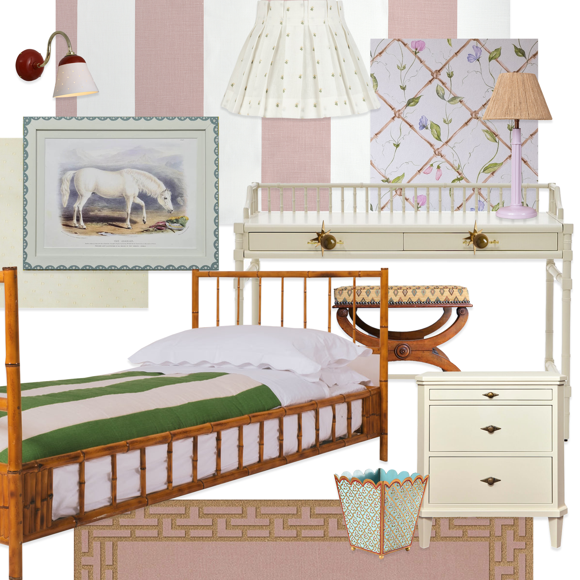 For this sweet little child’s bedroom scheme, I wanted to combine all the things I love best – bamboo, chintz and antique furniture. I’ve chosen our ‘Sweetpeas On Bamboo Trellis’ wallpaper as the backdrop, with a pretty canopy hanging over a lovely antique bamboo day bed. The pink and white stripe Cinny fabric offers a nice contrast to the florals in the room, with a Swiss Dot lining to soften it.