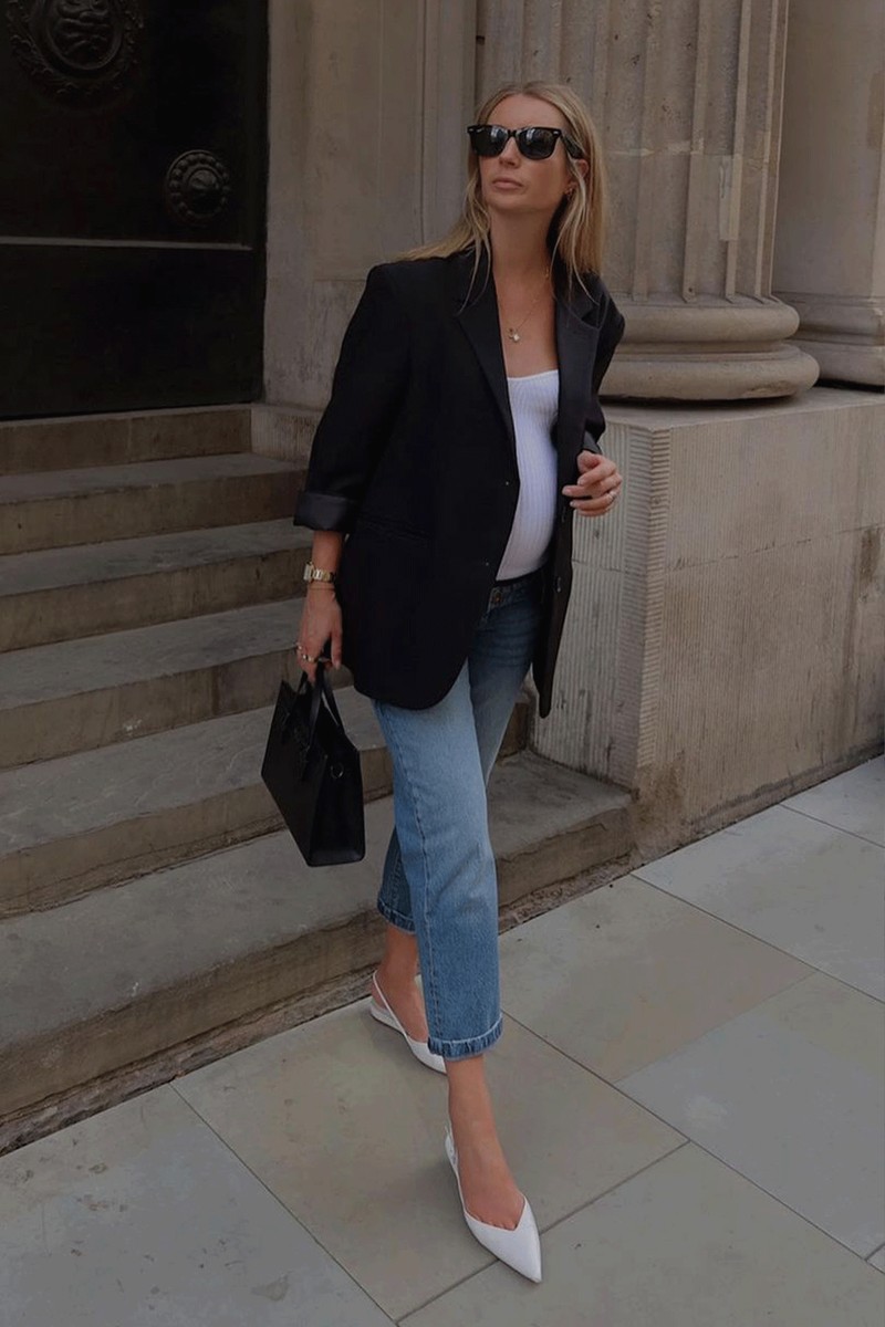 “Look for elasticated, waist tailored trousers and size up to wear them under your bump – it will help you to feel a little smarter. Acne, COS, Nanushka and The Row have some great options.”