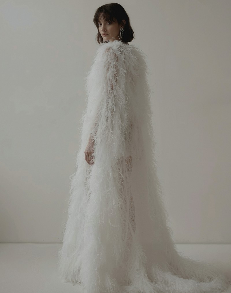 “Monique Lhuillier knows how to get bridal drama just right. Soft fringing and modern details make this look fresh and unforgettable.”