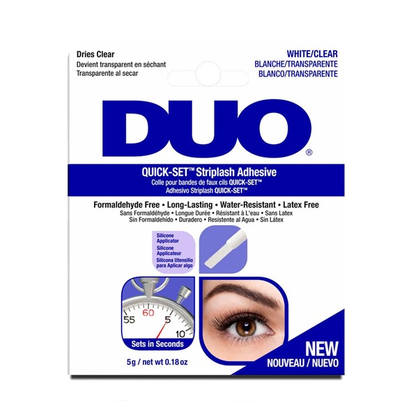 ‘Cluster’ or ‘partial’ lashes aren’t as fiddly as individuals or a full strip. They’re probably the easiest to apply, too. If you have some full strip lashes, consider cutting them in half, or into three sections to make them easier to layer along your lash line, or just apply one or two. False lash brands I rate include Lashify, Kiss, Vieve, InVogue and Eye Candy. Use Duo Glue as your adhesive – it comes in black and white, the latter of which dries completely clear. Apply it to your false lash and allow it to dry for about a minute so it becomes ‘tacky’. It’s much easier to position into place.