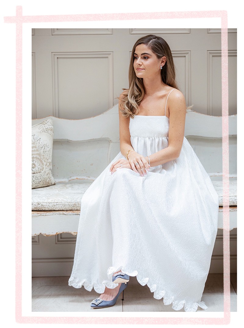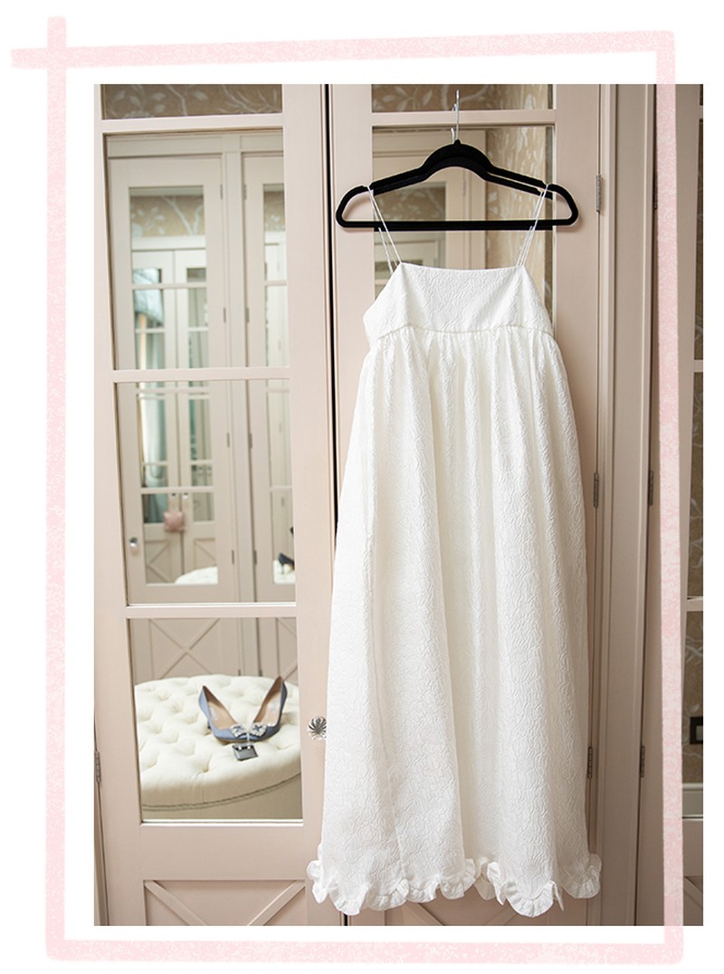 My original wedding dress is still waiting for me at Browns Bride in London. My Covid-19 ceremony dress was Cecilie Bahnsen, which I bought two weeks before the wedding. I wore the same Manolo Blahnik wedding shoes I’d planned to for the big wedding.