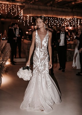 Finding a dress was challenging. Covid meant I started looking late, but I knew I would find one when the time was right. In the end I found it in Dubai by a designer called Eva Lendel. I knew I wanted to be comfortable on the day, so I ended up making quite a few changes to the dress – the design process was fairly long, but it meant I had my dream dress and felt so good all night. Before the first dance, I changed into an evening dress by Luce + Sposa. On the Friday night, I wore a sparkly dress by Kaviar Gauche.