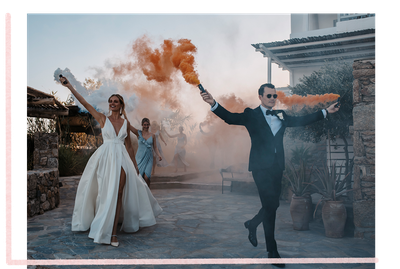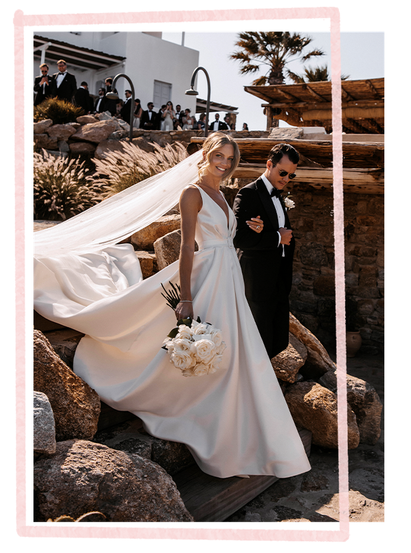 We got married at Soho Roc House in Mykonos and the pre-event was at Scorpios. Six years ago, when we went to Scorpios for the first time together, Lino had said it would be a cool place to get married. Since then, we’ve returned to Mykonos almost every year. Even though we looked at venues in Ibiza, Portugal and Finland, nothing ever came close. Then, when Soho Roc House opened within five minutes’ walking distance from Scorpios, we knew it was meant to be. They had never done a wedding at Roc House before, which was fine by us as we didn’t want a typical wedding anyway. We wanted the weekend to feel like a big party, so we took over the entire Soho House for the weekend (though most of our guests ended up staying for at least a week). Lisa from Isla & Smith was our planner, and we couldn’t have done it without her.