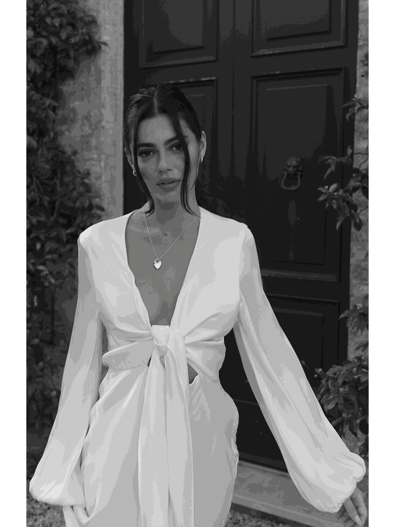 Perfect for a civil ceremony or rehearsal dinner, this made-to-order piece features long sleeves, a side zip, tie front fastening, palazzo flowing trousers with the option to wear the tie at the front or back based on your preference.