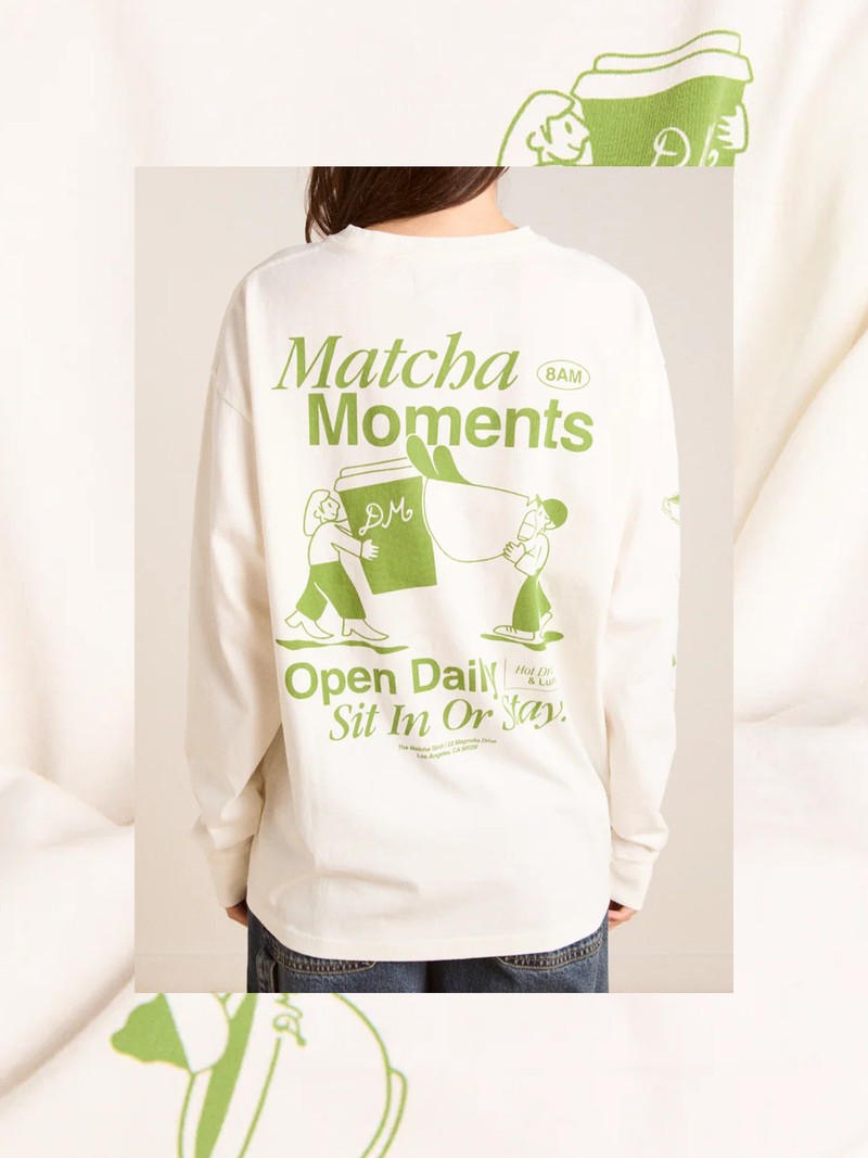 Scandi-inspired fashion label Damson Madder has dropped a playful top for those who want to wear their matcha obsession on their sleeve – literally. The ‘Matcha Moments’ tee, cut from organic cotton in an oversized silhouette, comes stamped with bold front and back prints that nod to the ritual.