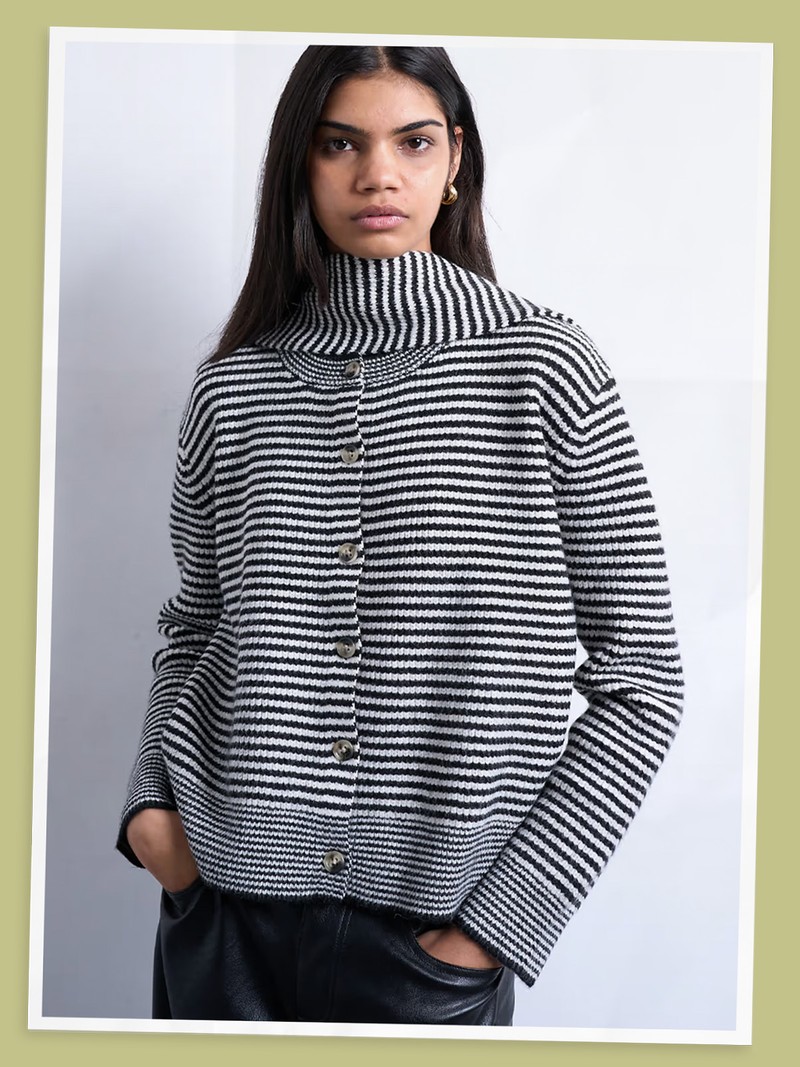 Scarf detailing is everywhere right now and this monochromatic cardigan will make a chic addition to any knitwear collection.