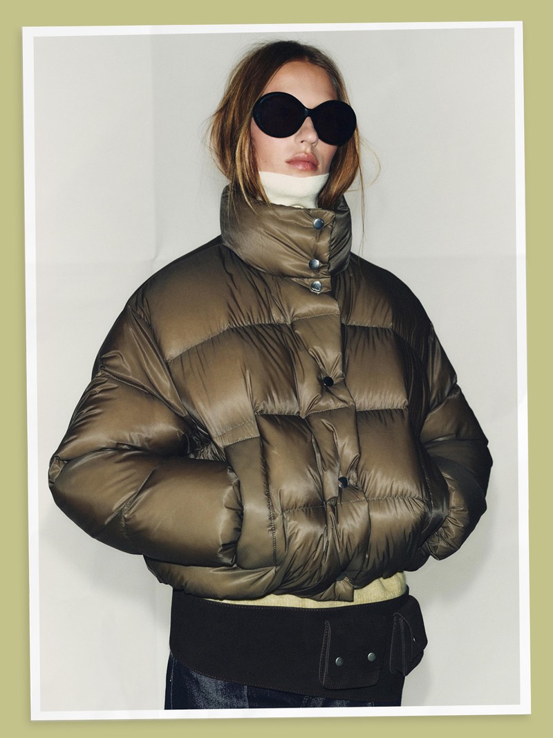 This glossy, oversized puffer is the ultimate throw-on piece. Practical and versatile in equal measure, it works over almost anything.