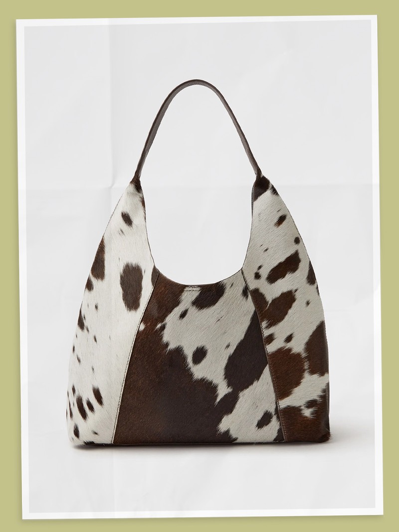 This cow-print shoulder bag is the kind of standout accessory that instantly injects some personality into your all-black look.