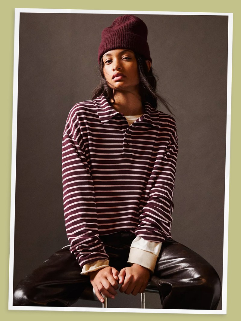 Whether you layer it over a white tee or drape it over your shoulders, this striped polo will add that relaxed, sporty edge to any autumn outfit.