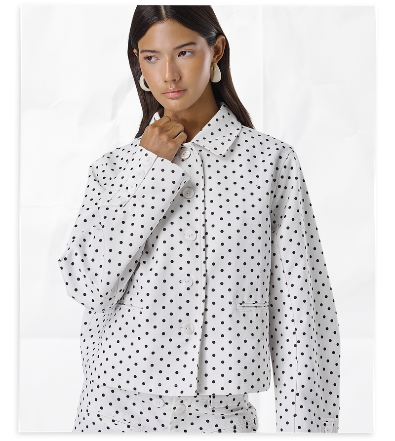 Polka dots are everywhere, and this cropped jacket is a fun way to wear them – try it with tailored trousers or long white Bermudas.