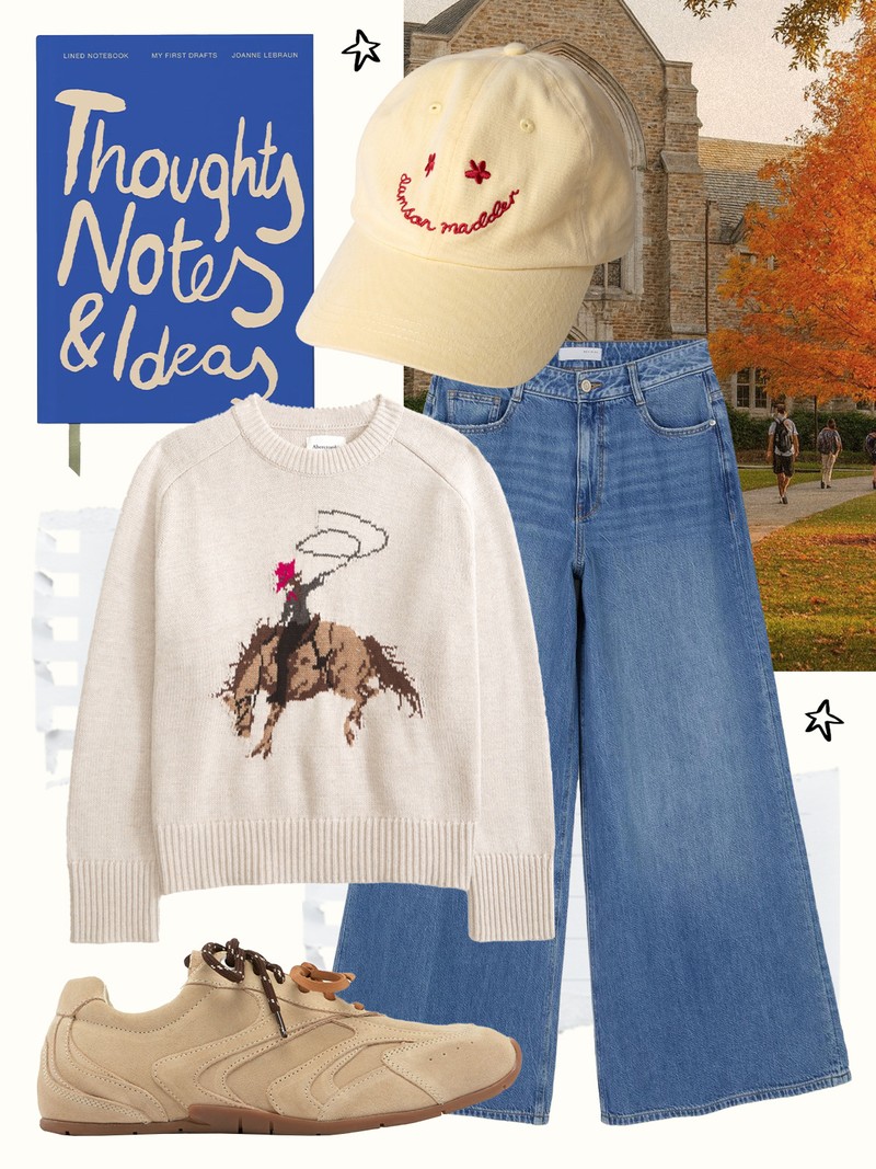 Baggy denim and a playful knit are a failsafe combo. A cap keeps it relaxed, while cool trainers finish things off. Great for busy days when you still want to look put together on the go.