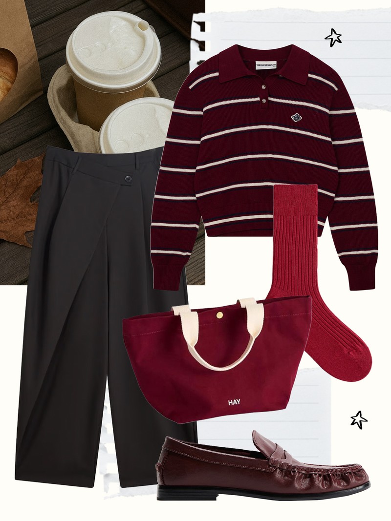 Rugby shirts are trending but tailored trousers will help smarten them up for uni. Burgundy accessories are just that little more interesting than black, while loafers add to the preppy vibe.