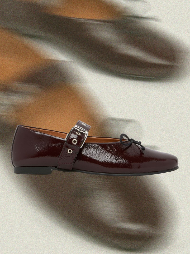Ballet flats are the cool girl's answer to comfortable, transitional footwear and the Lucinda is the perfect way to tap into the trend. With a glossy burgundy finish, subtle bow detail and buckle strap, it strikes the perfect balance between classic and edgy – pair them with slouchy denim or a miniskirt.