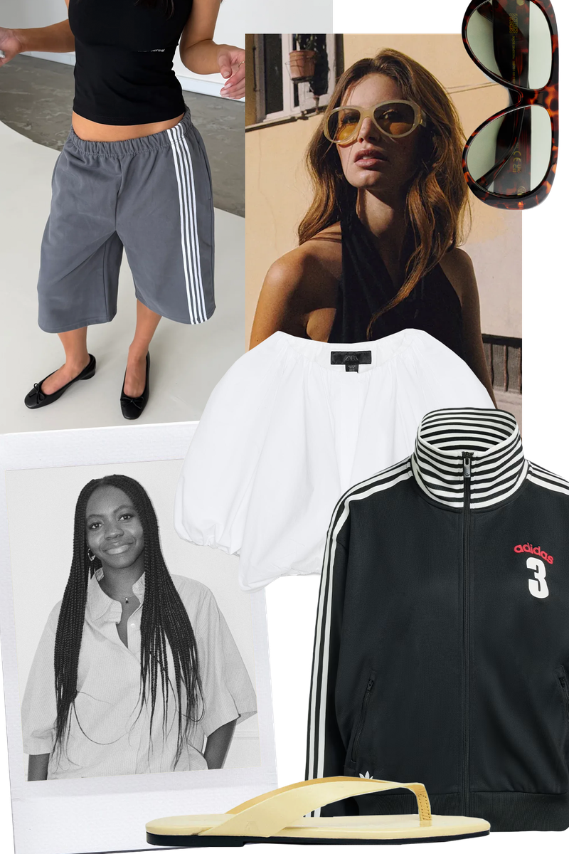 An adidas tracksuit is my forever uniform and this polka-dot style is the definition of a day-to-night staple. I’m styling mine with a crisp white tee and this boxy funnel-neck leather jacket to keep things sharp. Since I’m not quite ready to drop the winter accessories, this mohair bucket hat is an easy way to elevate my outfit. Looking ahead to spring, these bubble-hem shorts are top of my list – effortless with a slogan tee for daytime coffee runs or paired with an oversized blazer for dinner out.
