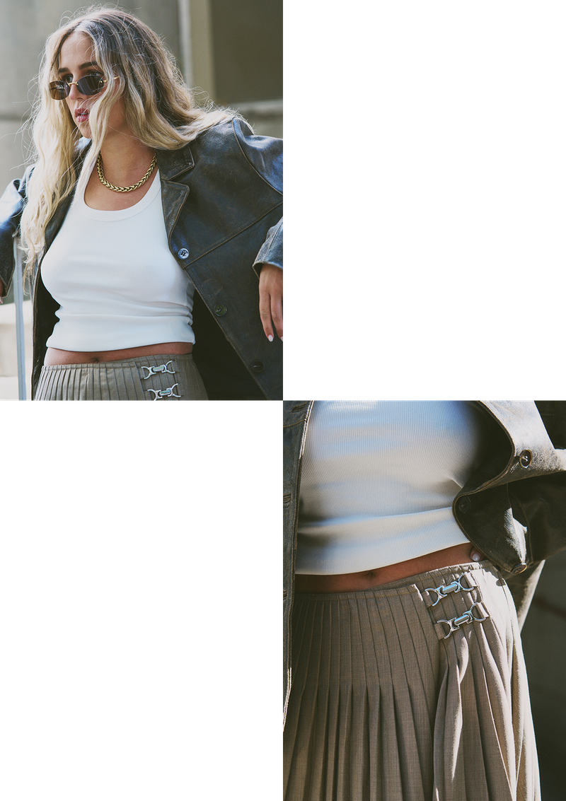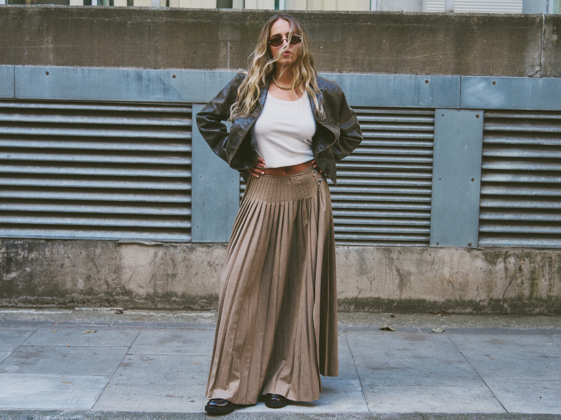 H&M always has its finger on the pulse when it comes to the season’s biggest trends – case in point, this pleated maxi skirt. Worn with a 100% leather boxy jacket and tiny sunnies, it channels that 90s vibe perfectly.
