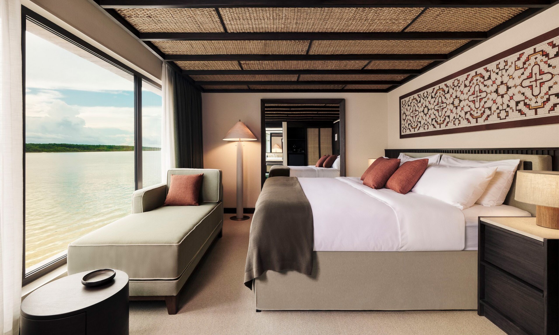 On any three-, four- or seven-night voyage, you’ll journey along the fauna-rich Pacaya-Samiria National Reserve. And while there’s plenty to keep you occupied on board – a library, two bars, a restaurant, a treatment room, a gym and even a jacuzzi on the top deck – it’s the thrice-daily skiff tours that linger in the memory. At 6am, 9am and 3pm, two skiffs – each led by a naturalist – take Leica binocular-clad guests out on the water for an hour or two, stopping whenever an interesting animal appears (we saw toucans, three-toed sloths, pink river dolphins and woolly monkeys on our trip). There was also a jungle walk one morning and options for river swimming, piranha fishing and kayaking during the afternoons – all of which helped to work up an appetite for the catfish ceviche lunches and the elevated five-course Peruvian dinners the chefs prepare each evening, which come paired with Latin-American wines.